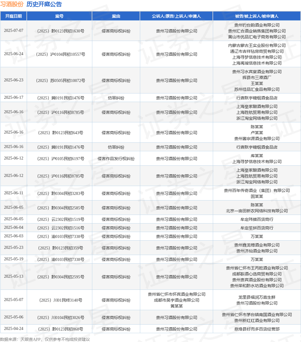 案号:(2025)沪0104民初10557号审理法院:上海市徐汇区人民法院案由:侵害商标权纠纷当事人信息: 原告/上诉人:贵州习酒股份有限公司 被告/被上诉人:内蒙古蒙古王实业股份有限公司、通辽市吉祥毡房商贸有限公司、上海寻梦信息技术有限公司、上海禹璨信息技术有限公司开庭日期:2025年6月24日根据统计,近一年内以贵州习酒股份有限公司为当事人的历史开庭公告有76则,其中案由为“侵害商标权纠纷”的公告以59则居首,其次为“不正当竞争纠纷”有7则,“仿冒纠纷”有2则。历史开庭公告(前20条)如下: