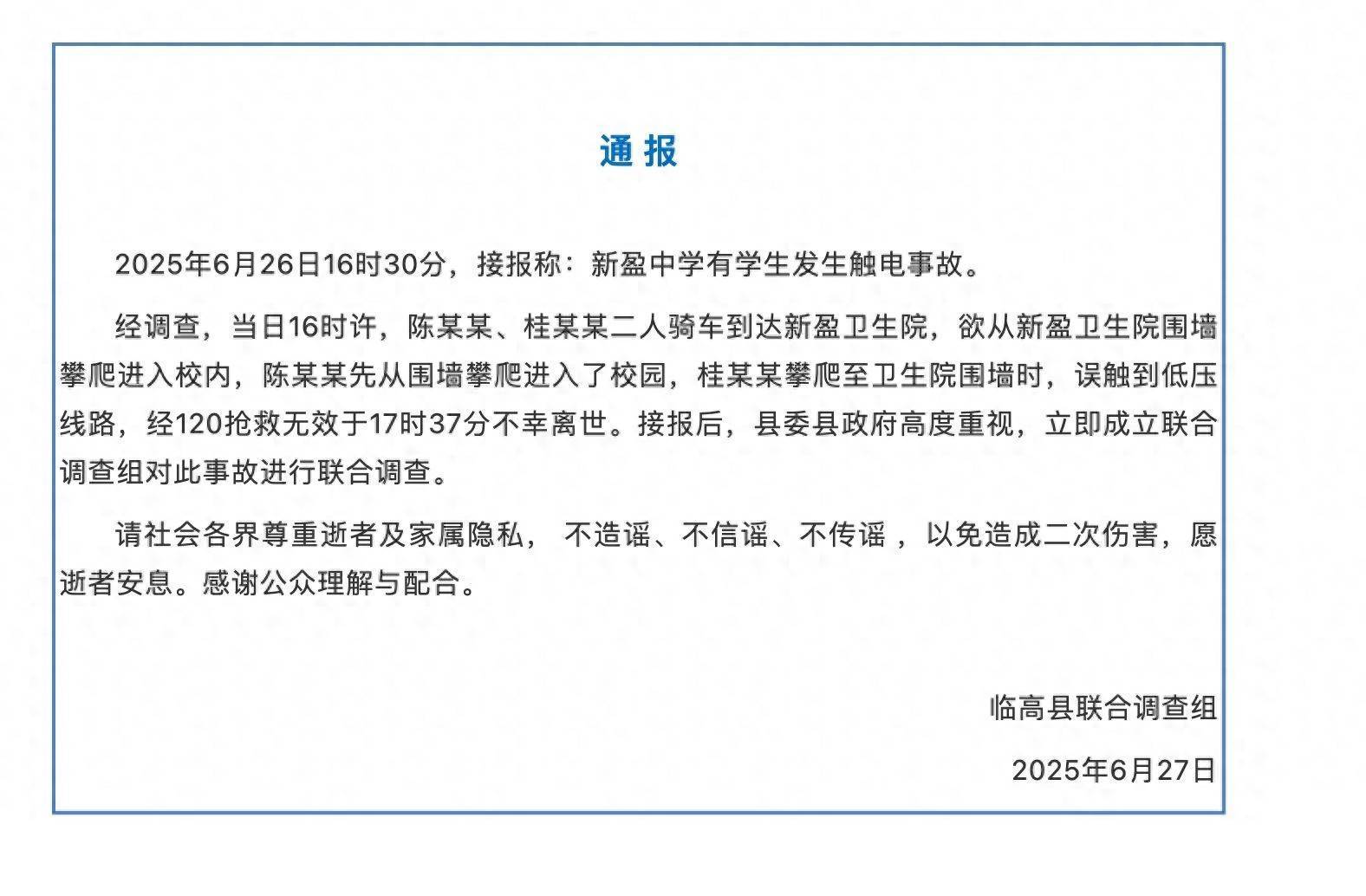经调查,当日16时许,陈某某、桂某某二人骑车到达新盈卫生院,欲从新盈卫生院围墙攀爬进入校内,陈某某先从围墙攀爬进入了校园,桂某某攀爬至卫生院围墙时,误触到低压线路,经120抢救无效于17时37分不幸离世。接报后,县委县政府高度重视,立即成立联合调查组对此事故进行联合调查。