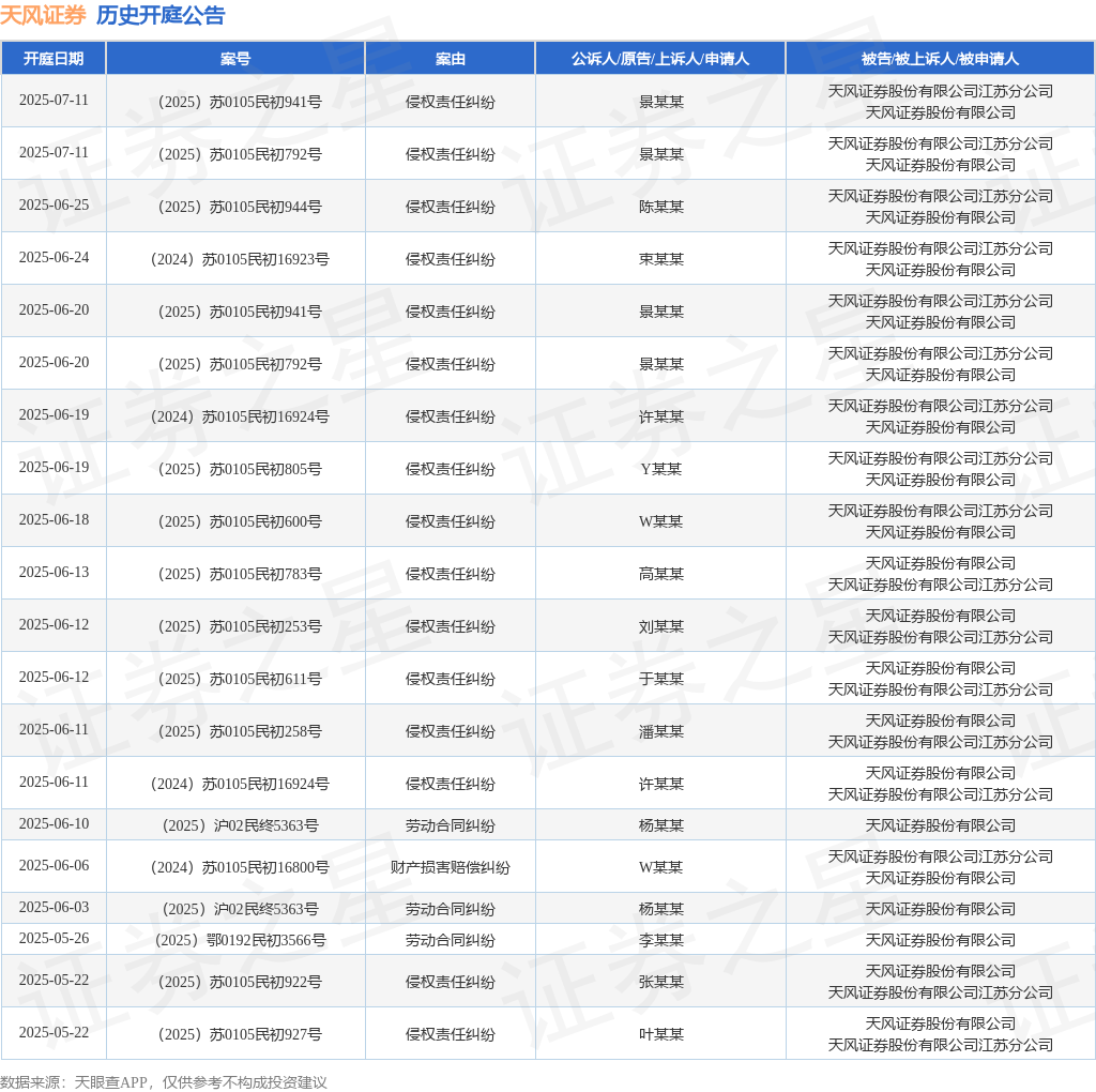案号:(2024)苏0105民初16923号审理法院:南京市建邺区人民法院案由:侵权责任纠纷当事人信息: 原告/上诉人:束某某 被告/被上诉人:天风证券股份有限公司江苏分公司、天风证券股份有限公司开庭日期:2025年6月24日根据统计,近一年内以天风证券股份有限公司为当事人的历史开庭公告有71则,其中案由为“侵权责任纠纷”的公告以28则居首,其次为“财产损害赔偿纠纷”有12则,“劳动合同纠纷”有11则。历史开庭公告(前20条)如下:
